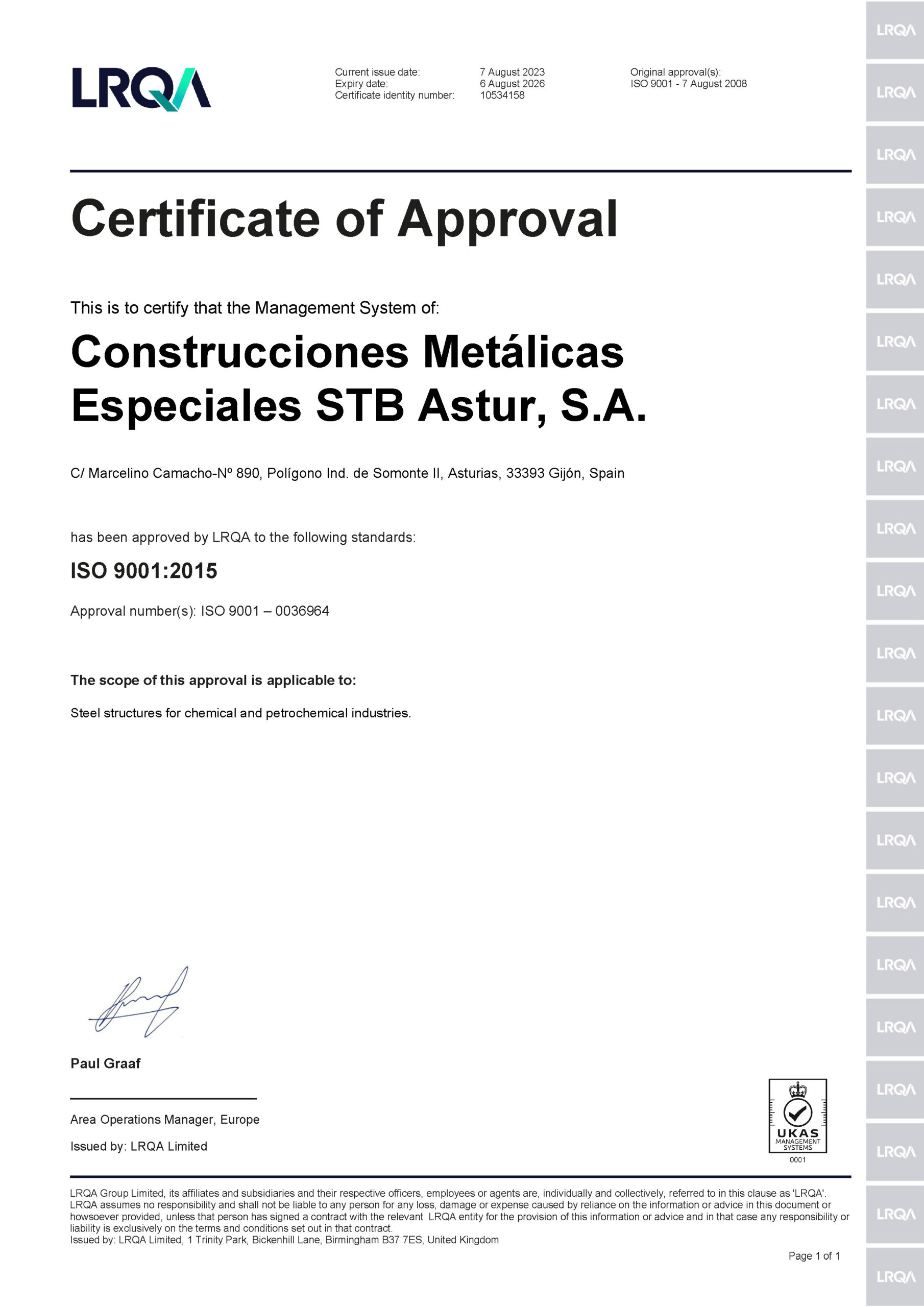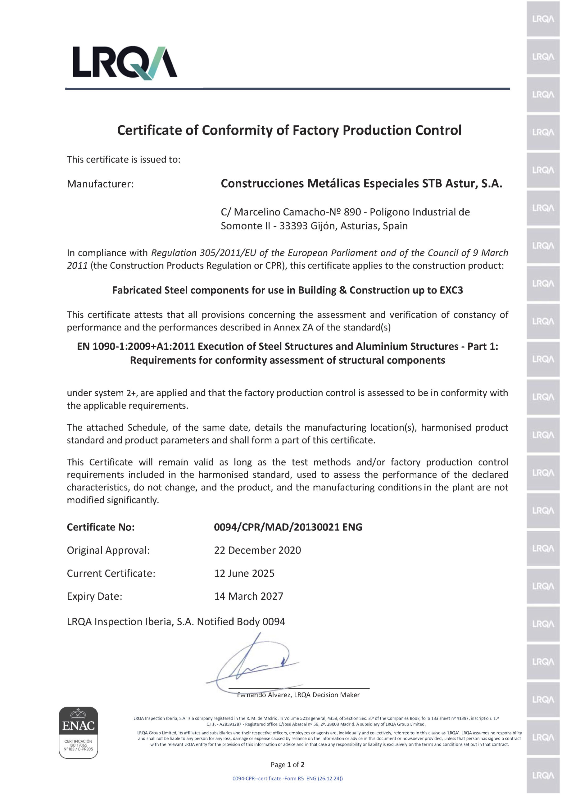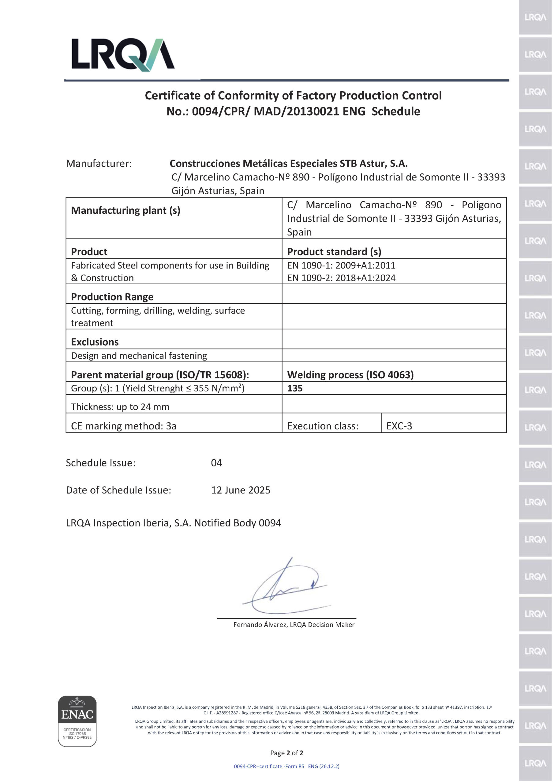 On March 2012, STB ASTUR has obtained the EN 1090 norm certification that will allow us to mark all our products with the CE marking.